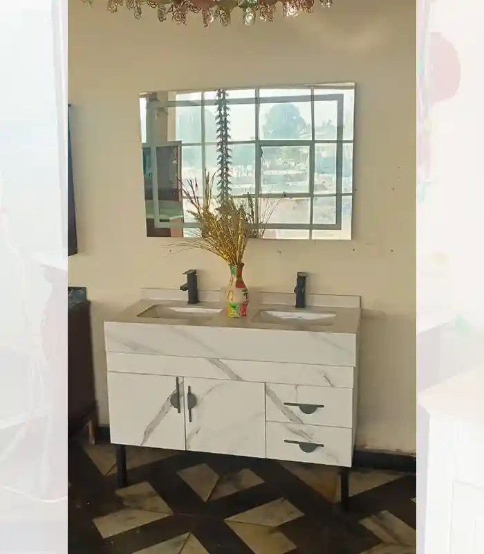 This hand-wash vanity in white features double rectangular bowls, making it a practical and stylish addition to any bathroom. The white color adds a clean and modern touch, while the double bowls provide ample space for washing and grooming. The rectangular shape adds a sleek and contemporary look to the vanity, making it a versatile choice for various architectural styles. Additionally, the hand-wash feature ensures easy maintenance and hygiene. Add a touch of functionality and elegance to your bathroom with this hand-wash vanity.